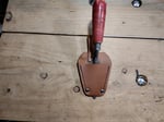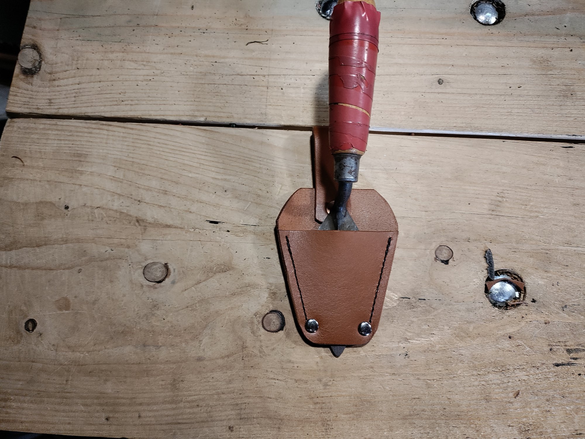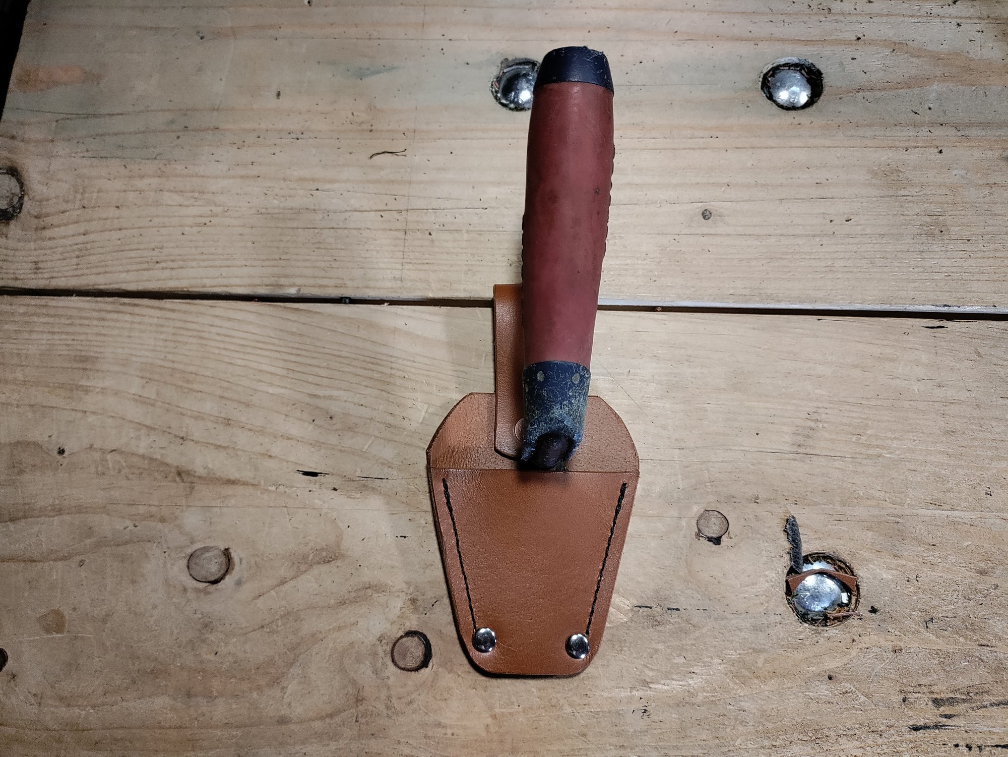 The belt loop is fastened with a copper saddle rivet, and the leather sections are stitched using polyester thread, to help it be more weather proof. Will hold the trowel securely in place, even if its just a stub left! Available in other colours to order.