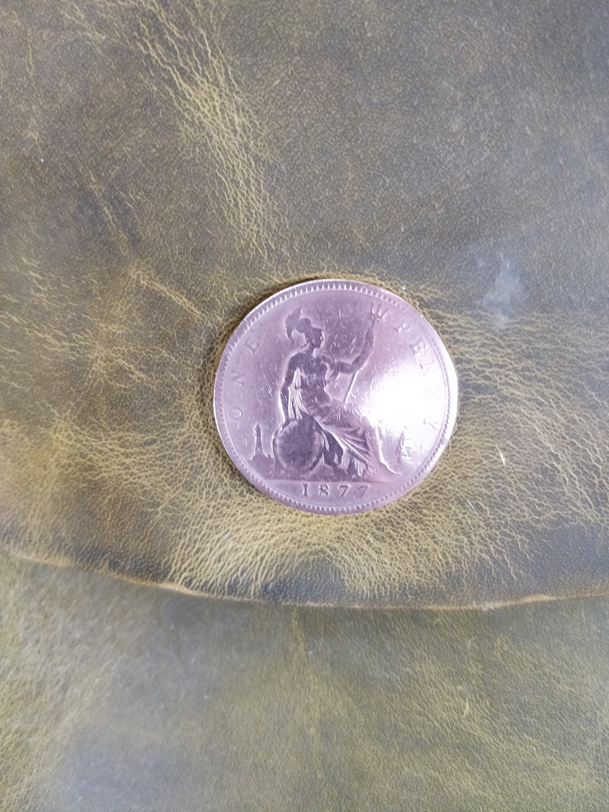 The clasps are solid brass horse harness fittings, and, of course, our signature mark coin on the front is a Victoria penny from the 1877 publication date.