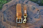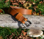 The perfect (we think) jeans belt, in a robust, slightly distressed veg tan leather. This leather shows pale when folded, due to the high wax and oil content that it has, which gives it a rugged appearance. Available with brass buckle in dull or polished nickel finish, or just brass, and in a variety of stitching options.