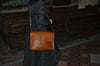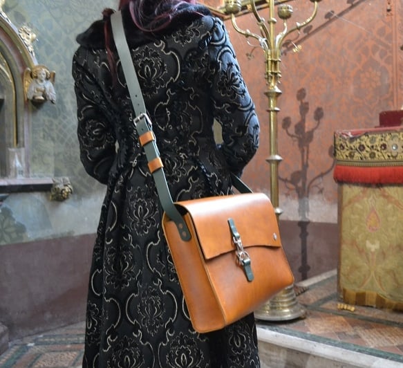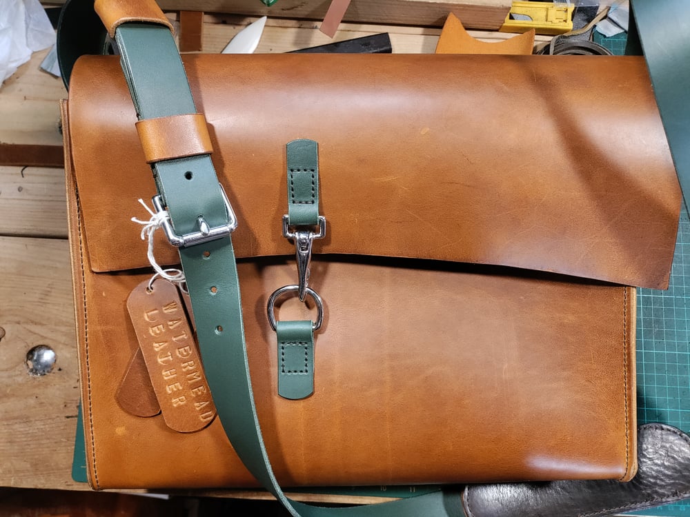 This is a beautiful bag. Made from 2mm Lyvden distressed tan leather, with a green Lamport strap and polished bright nickel horse harness fitting with a D ring. It has our usual, double thickness shoulder pad in grey Lyvden.