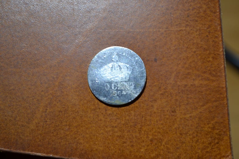 Journey to the Centre of the Earth, with it's browns and green, is inspired by the 1864 classic sci-fi by Jules Verne. The silver coin on the front is a French 10 cent from the year of first publication - 1864.