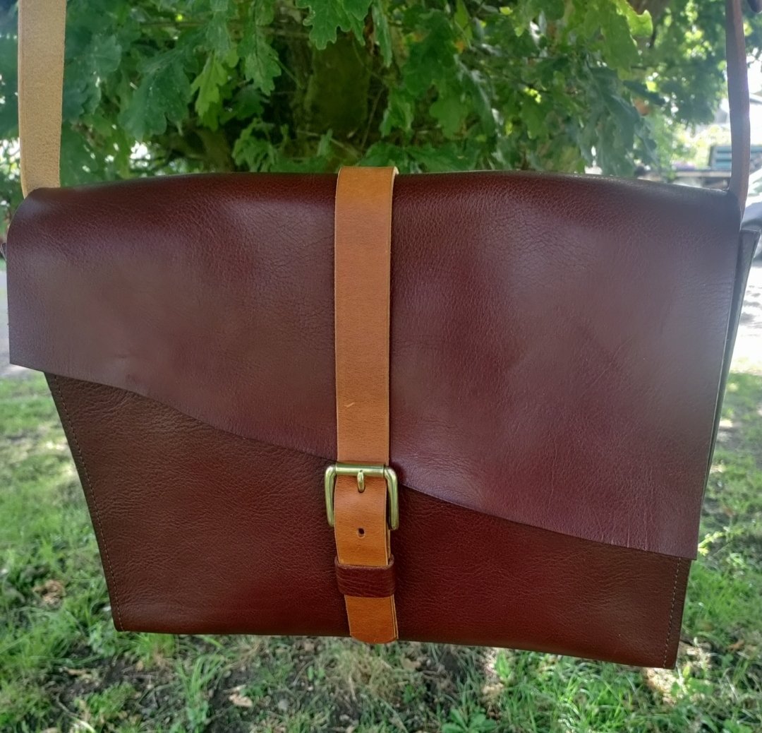 Made from stunning supple dark tan leather, this is a traditional looking satchel type messenger bag, with a Lyvden tan strap, held in place with copper rivets. The double thickness shoulder pad is in forest green. It has a single brass buckle and strap fastening.