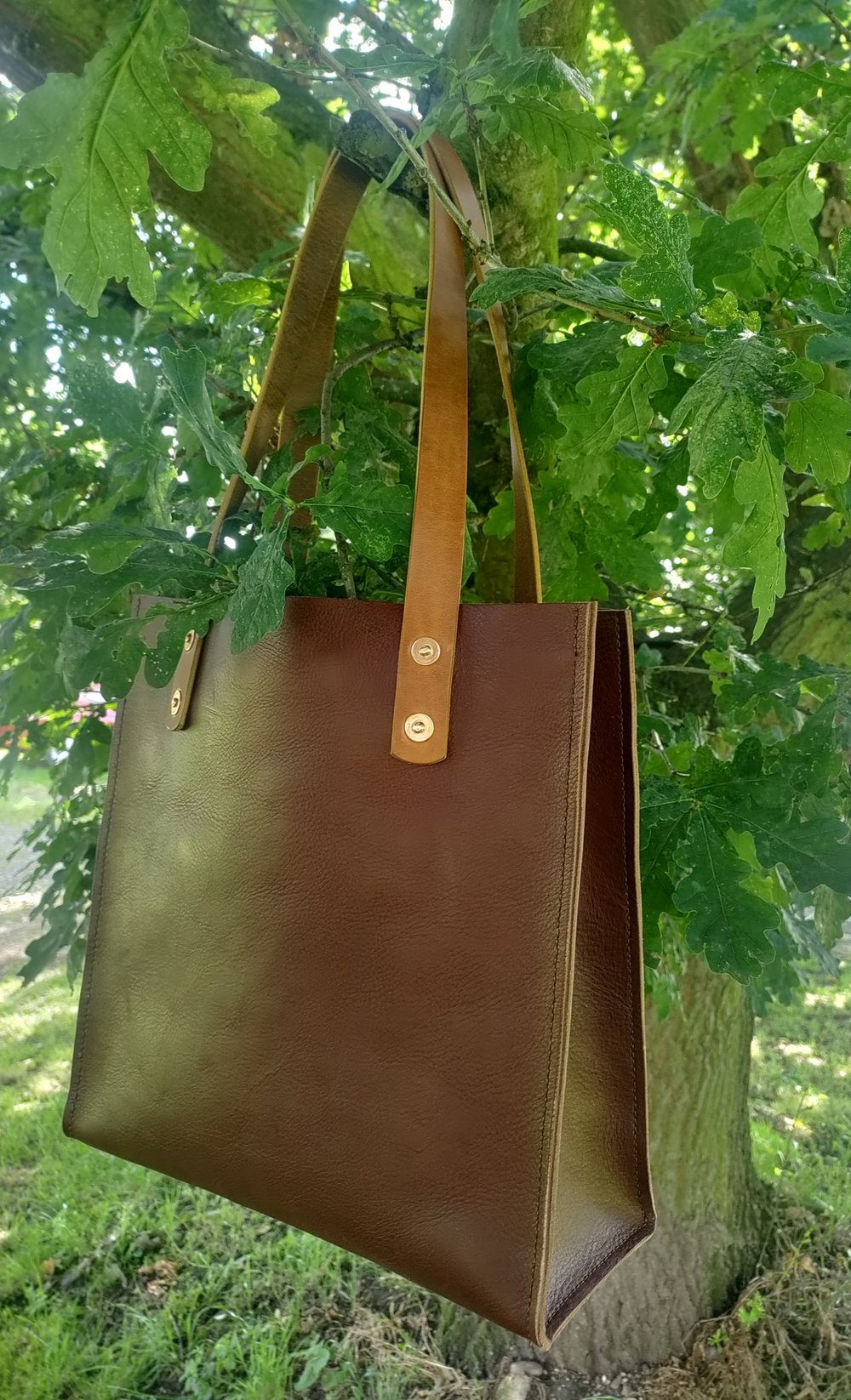 This beautiful variation of a tote is something else. Made from a single piece of soft chestnut leather, with sides hand stitched into place with linen thread. The utilitarian look of the copper rivets give it a great look. The handles are of 3 mm thick tan belt leather, which feel great to hold.